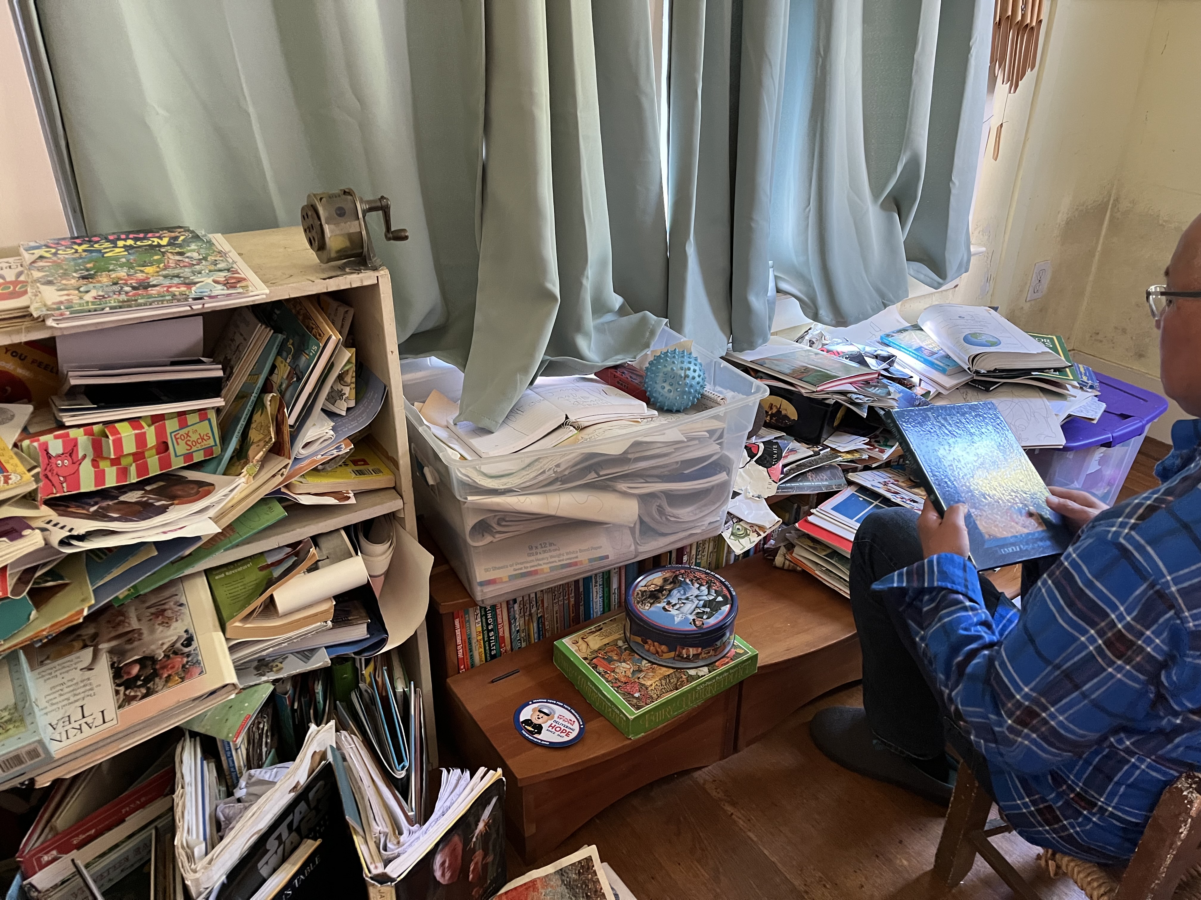 The author’s husband doing the hours-long process of sorting and putting away books from one of Sean’s book piles.