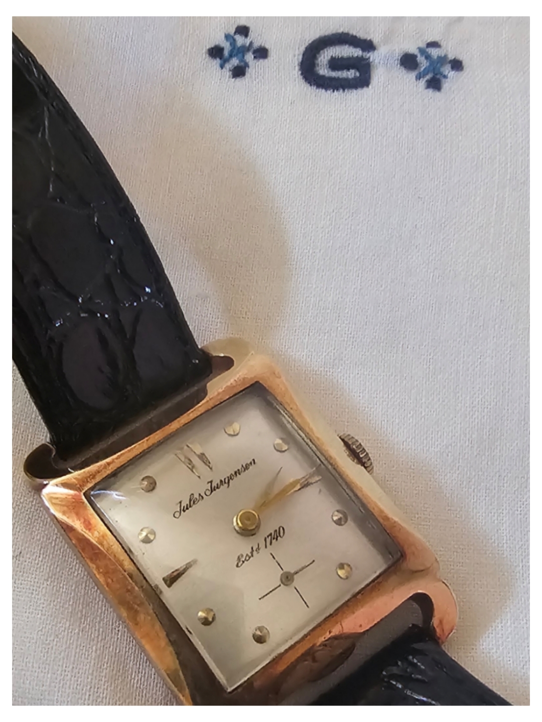 My dad's 14 karat solid gold Jules Jurgensen wristwatch was his pride and joy... until I came along. When my dad passed away, the watch became mine. For this photo, I placed the watch across the top of one of my dad's monogrammed handkerchiefs. Both items are hallmarks of the times and of the character of the man who wore them.