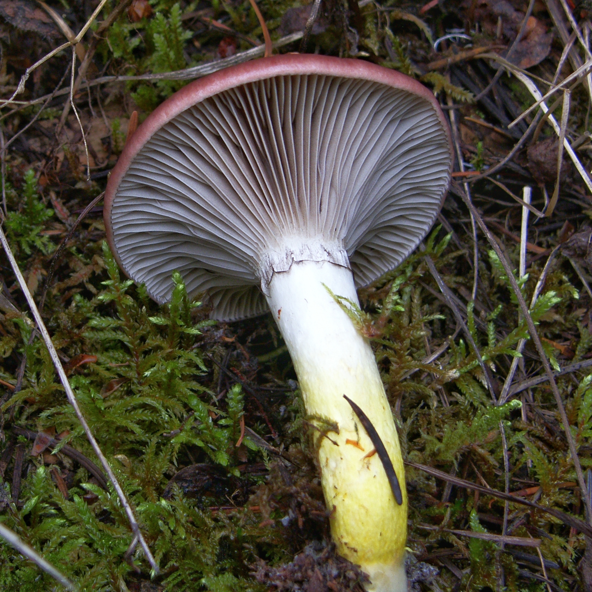 An easily identifiable autumn favourite of mine is the Rosy Slime Spike (Gomphidius subroseus), found throughout conifer forests in western North America (and less frequently in the east). The cap colour is a rosy red, fading to lighter tones as it matures. The stem is peg-like, with a bright yellow colour at the base. It is quite viscid (slimy) to the touch, and this will impart a very lovely sheen to its appearance. The gills become very decurrent (that is, running down the stem) and will appear to be dark grey in colour when mature due to the very dark spores that adhere to its gills.