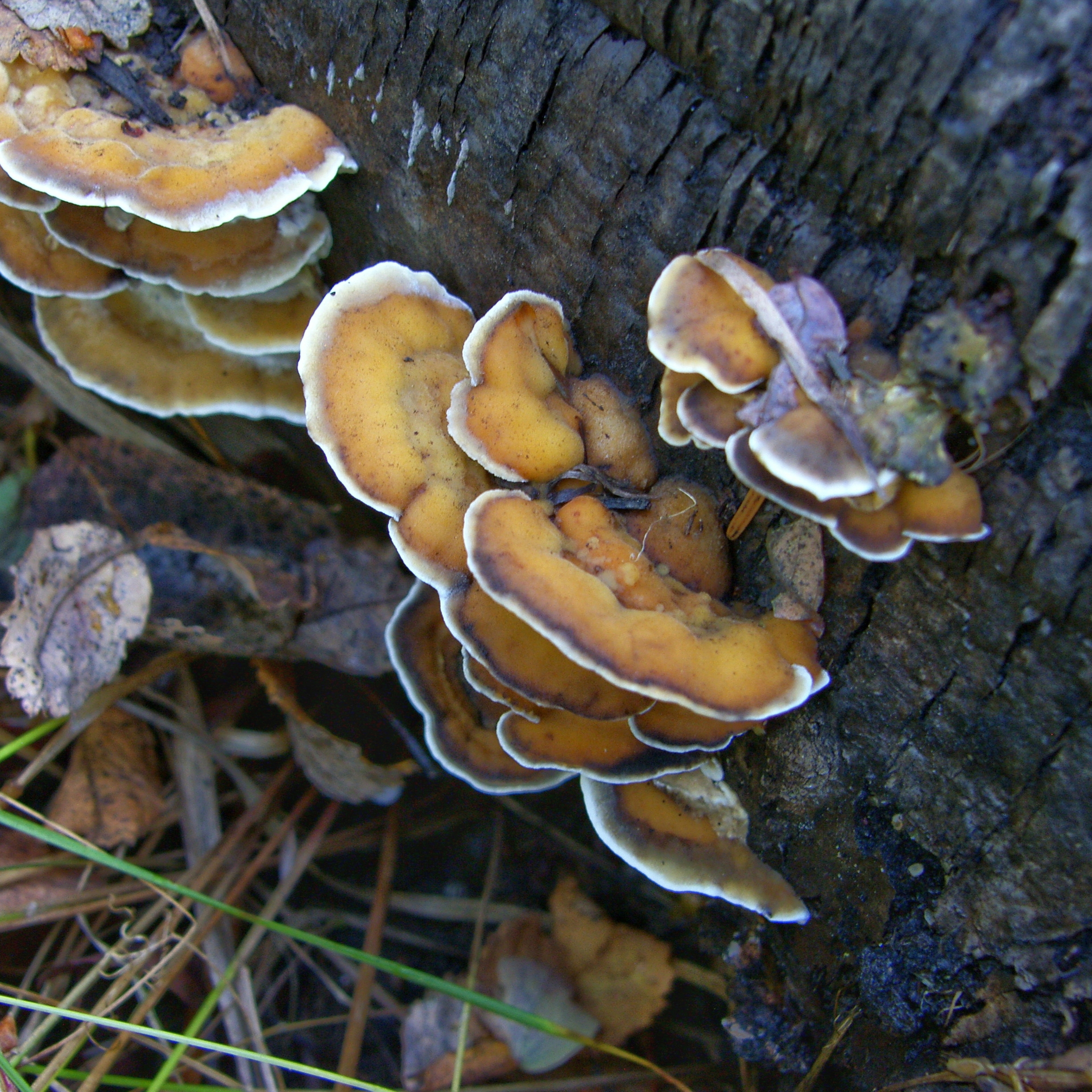 The Pear-Shaped Puffball (Apioperdon pyriforme) is the most common amongst these wood-lovers, and it can be found on both coniferous and hardwood hosts. Like many Puffballs, it’s usually covered in small spines when young that fade as the specimen matures. Its colour can range from a whitish hue to a yellow-brown. Fresh ones begin to appear in late summer and fall, and older ones can often be seen clinging to their hosts well after they have released their spores. And just like the name implies, it resembles an inverted pear upon closer examination.